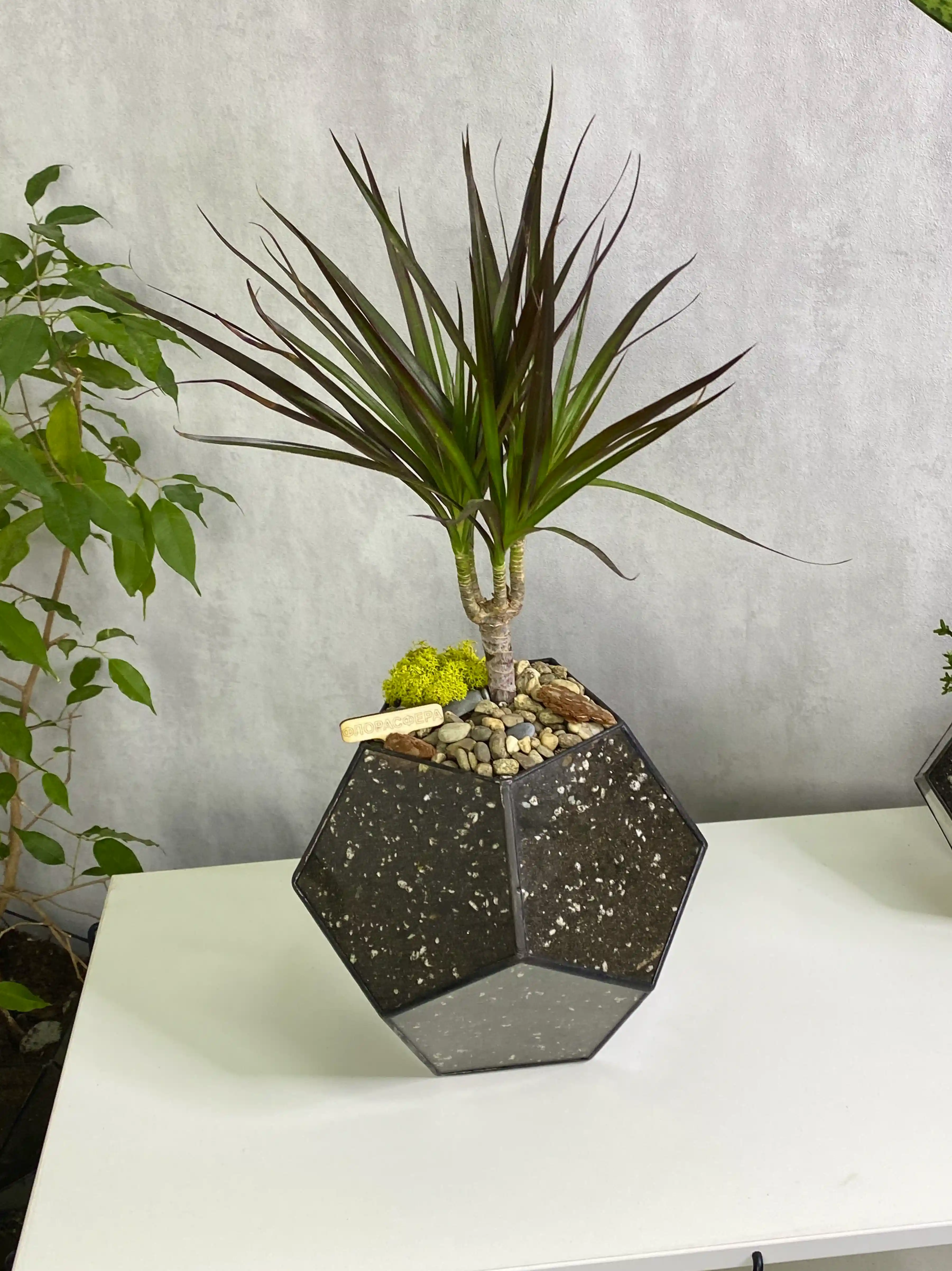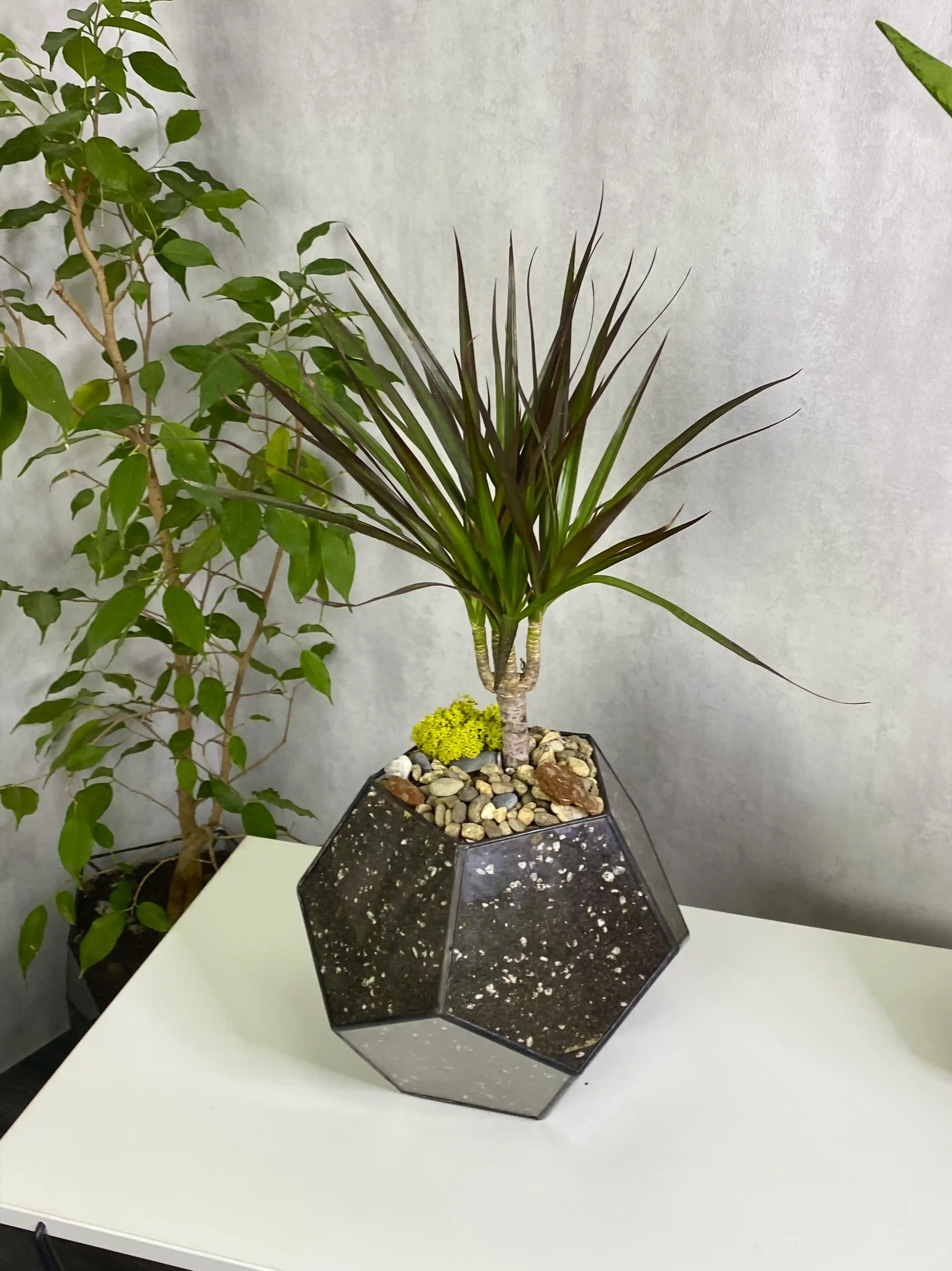 Драцена в флорариуме «морковка» — это стильное и красивое растение, которое украсит ваш интерьер. Оно имеет высокую и статную композицию с пальмой в современном оформлении.