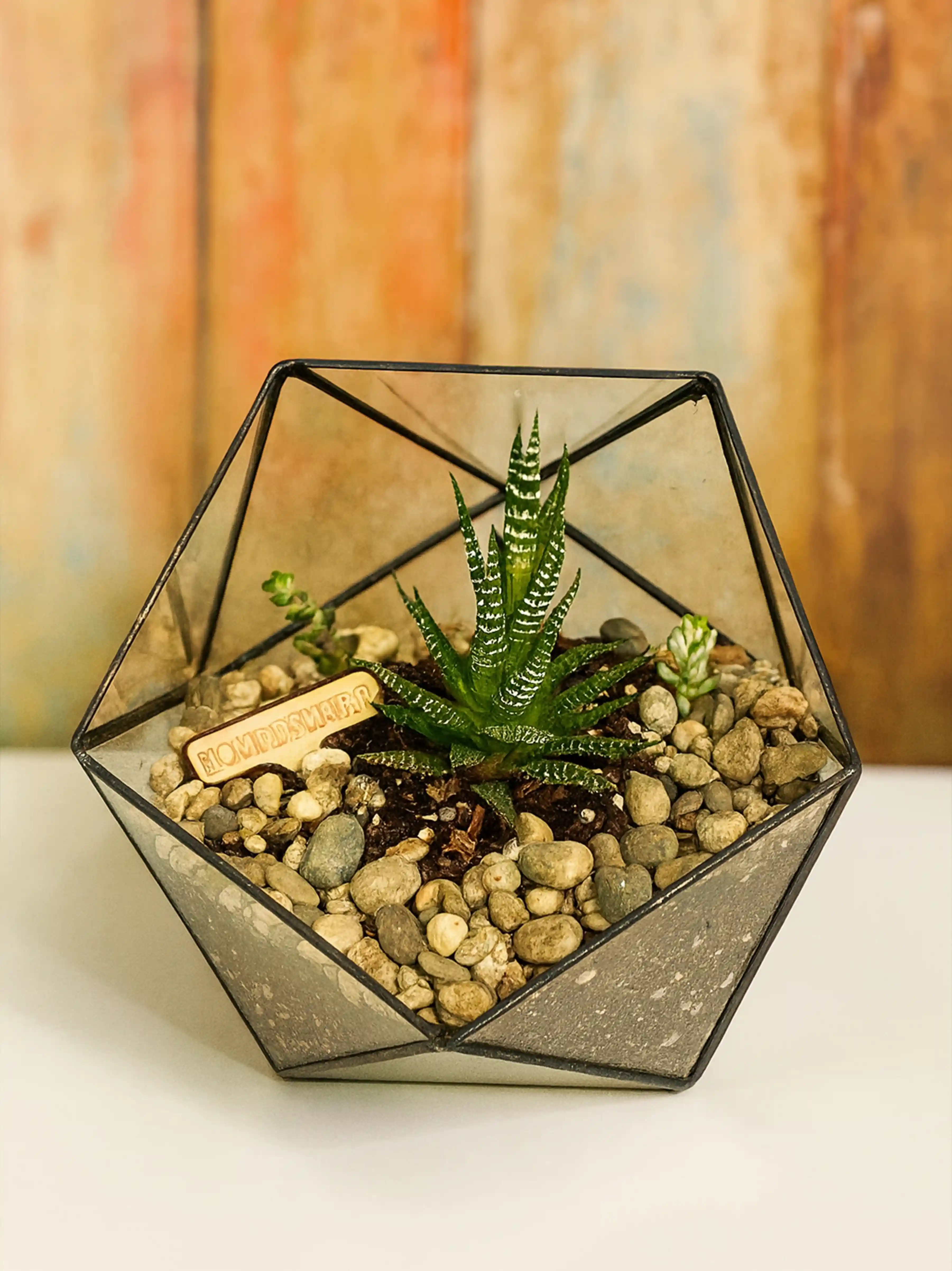 Комнатный цветок бонсай в геометрическом флорариуме «Айсберг». Флорариум с растением фикус микрокарпа подходит для оформления пространства офиса или на подарок ценителям необычных деревьев в современном кашпо.