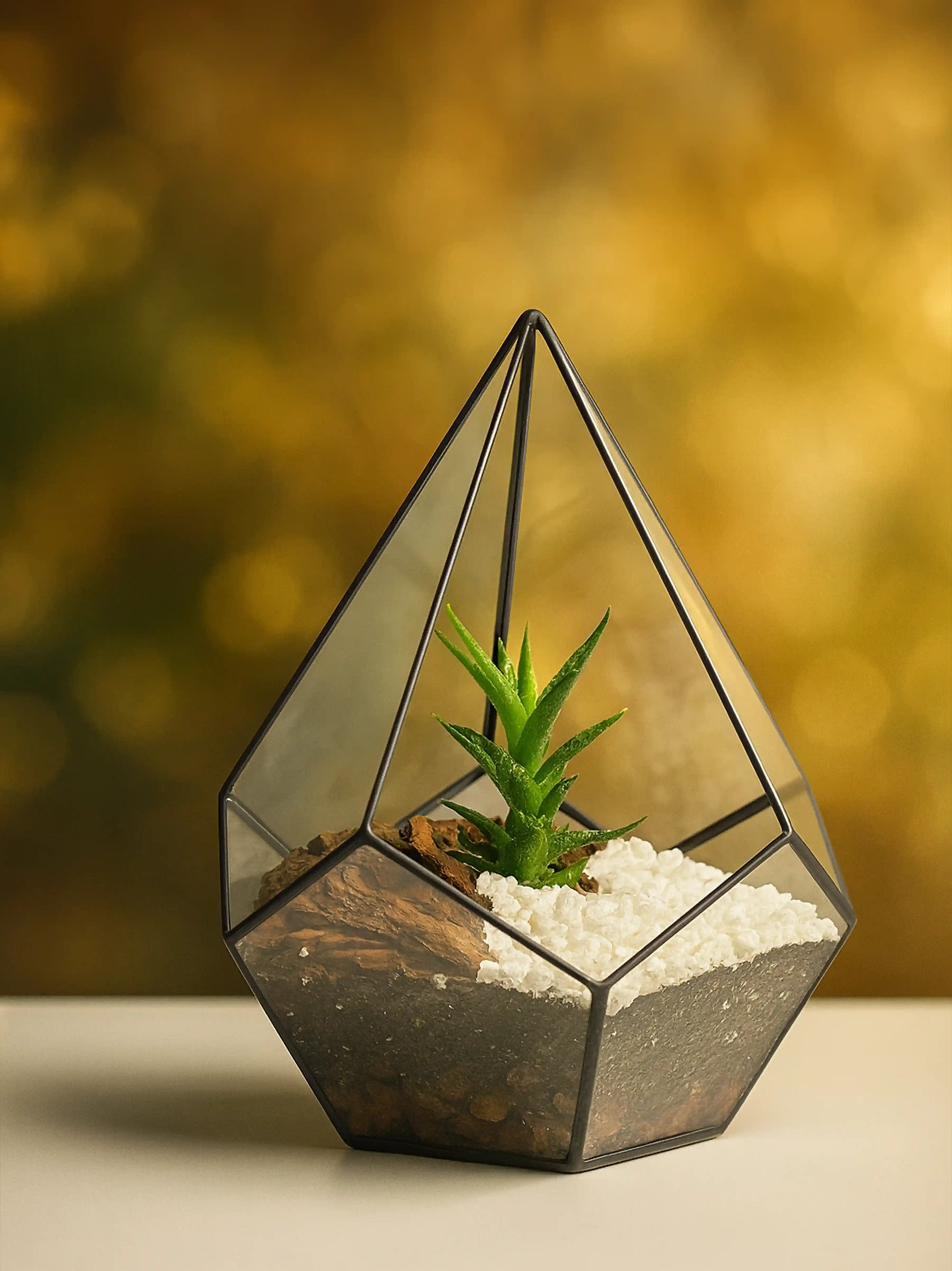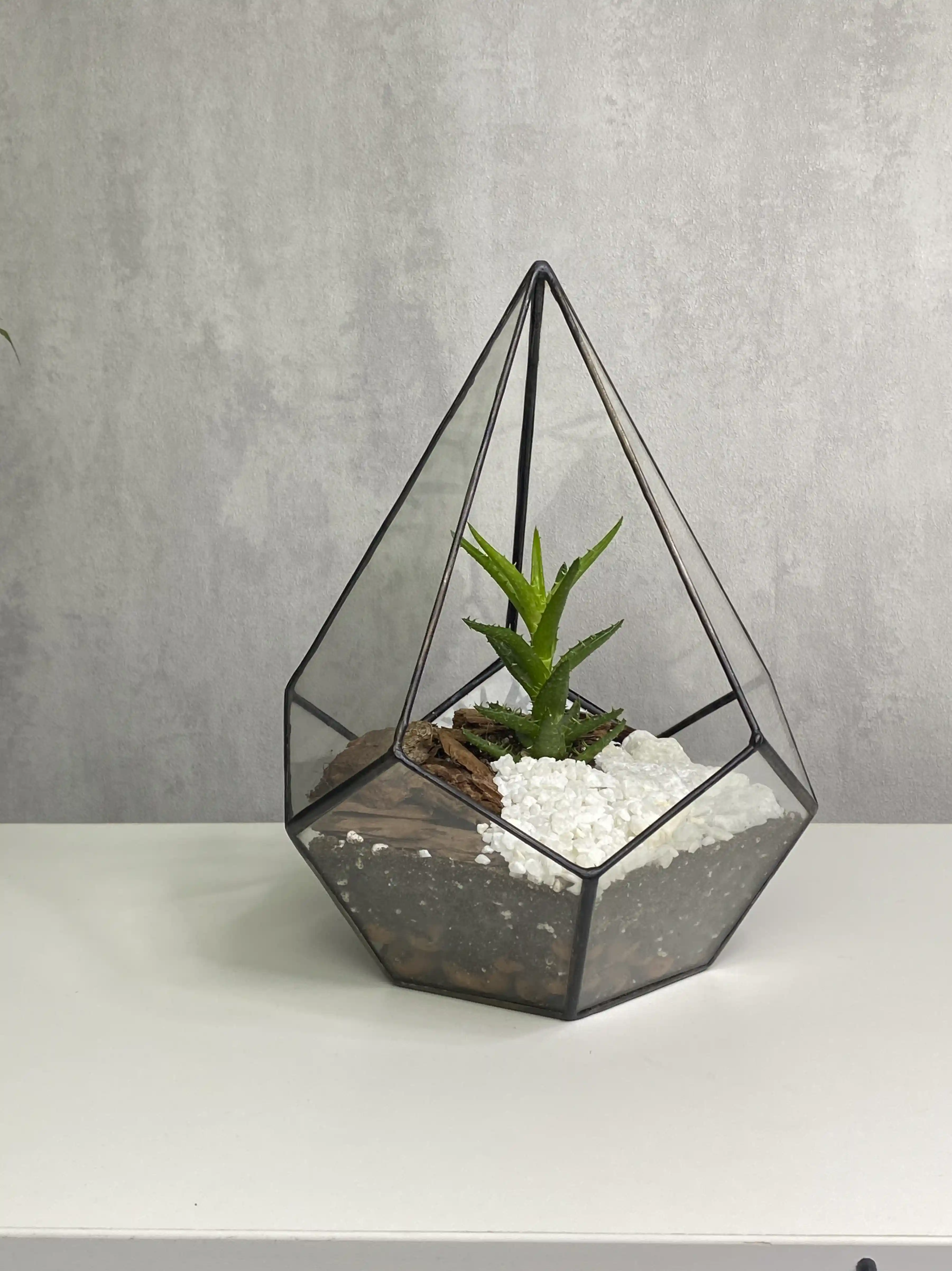 Важно учесть, что данное изделие содержит стеклянные элементы, скрепленные металлическим сплавом, который не гарантирует полной непроницаемости и может допустить протекание при скоплении воды на дне кашпо. Поливайте умеренно или если предусмотрен, докупите поддон.