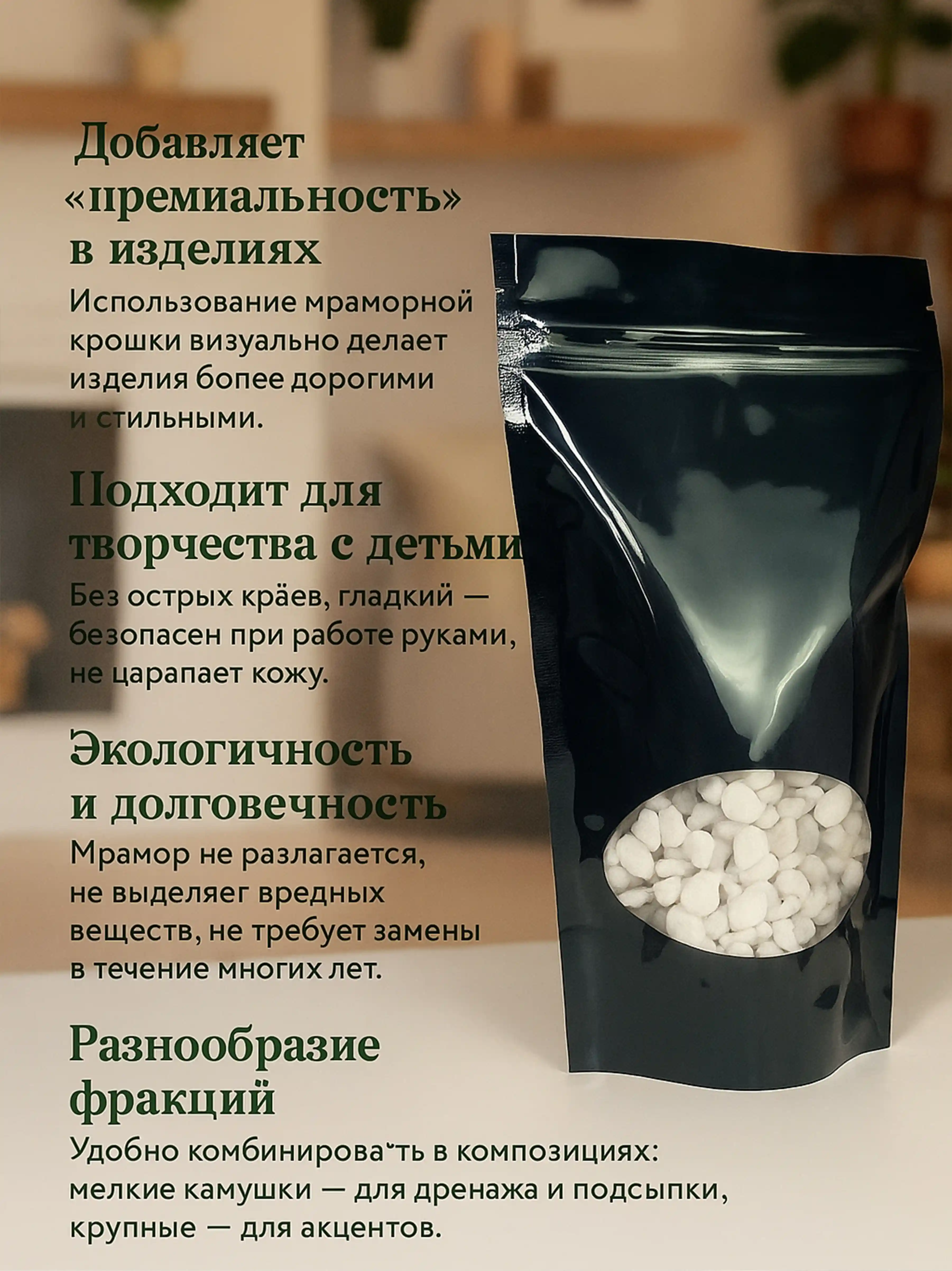 Белая мраморная крошка — это не просто декоративный элемент, а функциональный материал для создания аккуратных и долговечных композиций. Благодаря галтованной обработке камни имеют сглаженную форму без острых краёв, что делает их безопасными для стеклянных флорариумов и корневой системы растений.