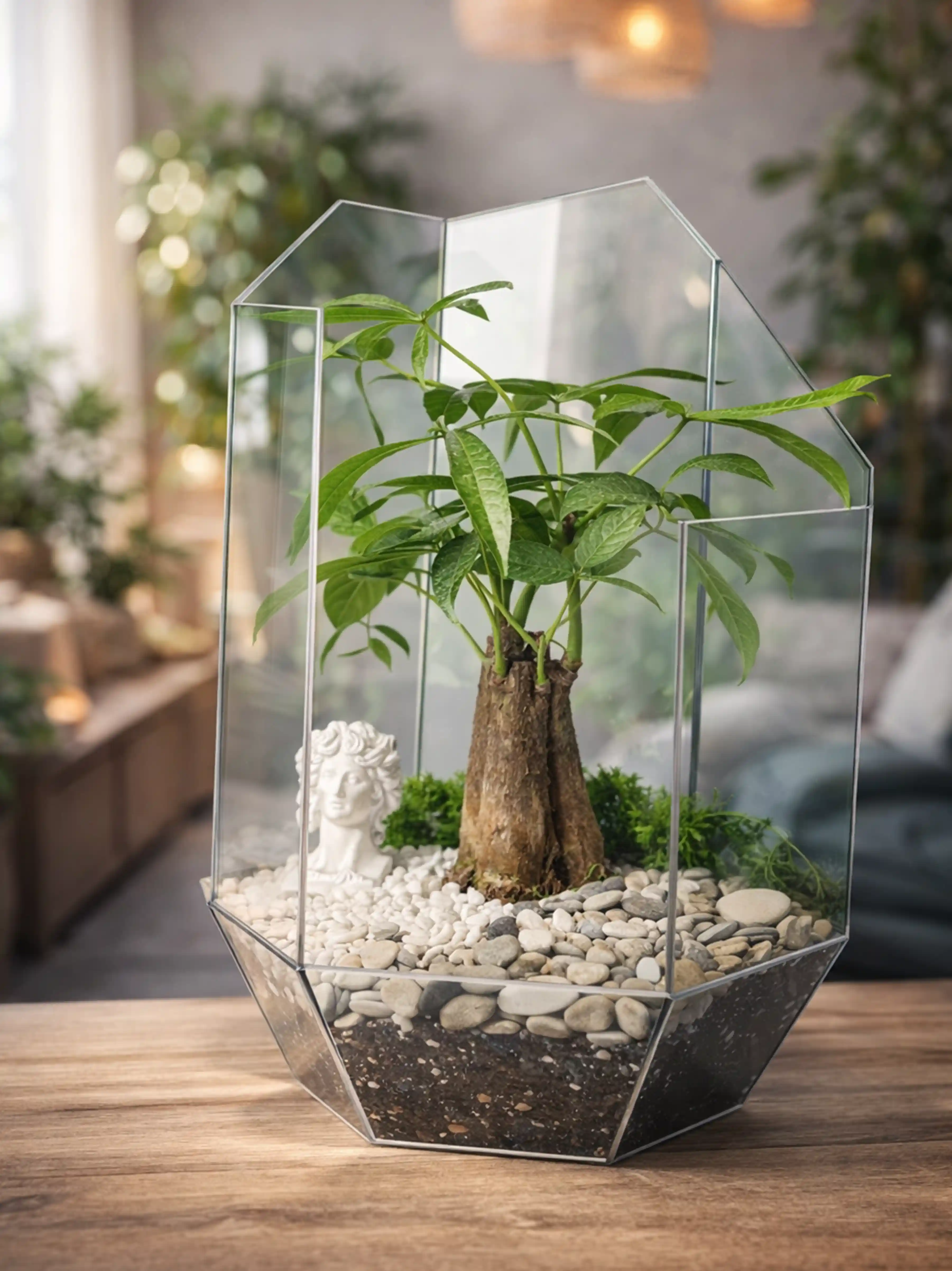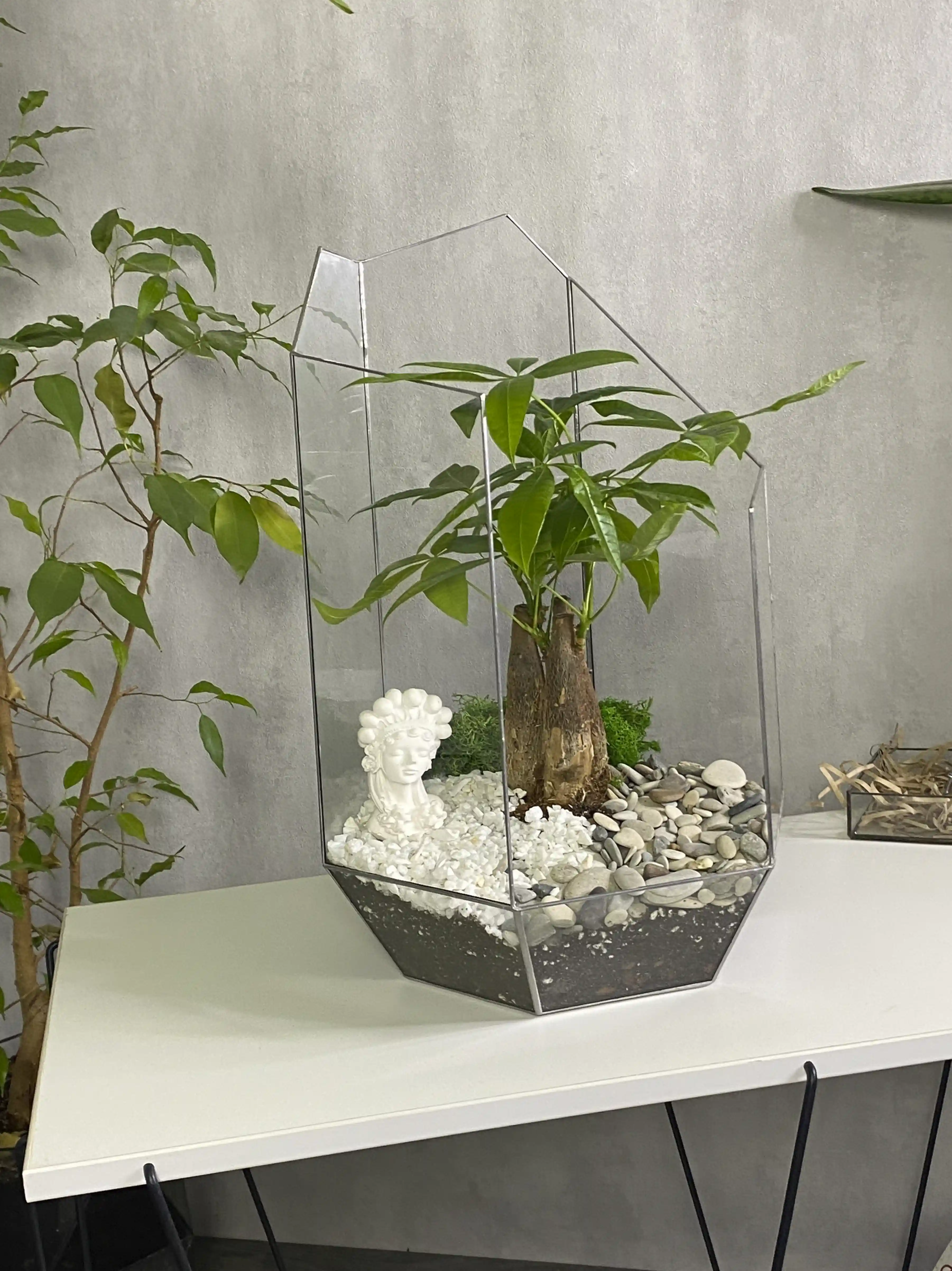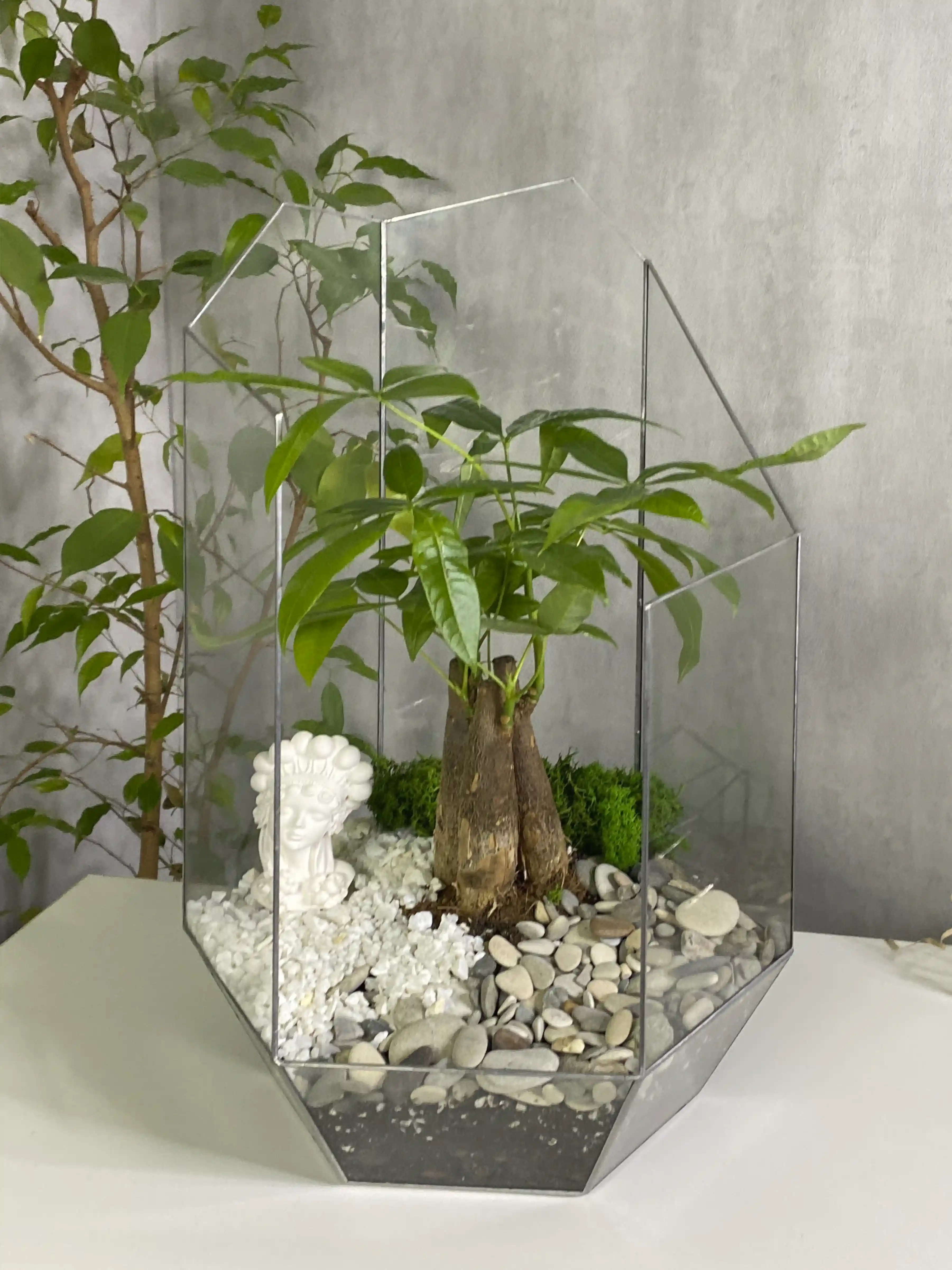 • Современный дизайн: Минималистичный и стильный флорариум идеально дополняется пышной кроной пахиры, формируя неповторимый визуальный эффект.