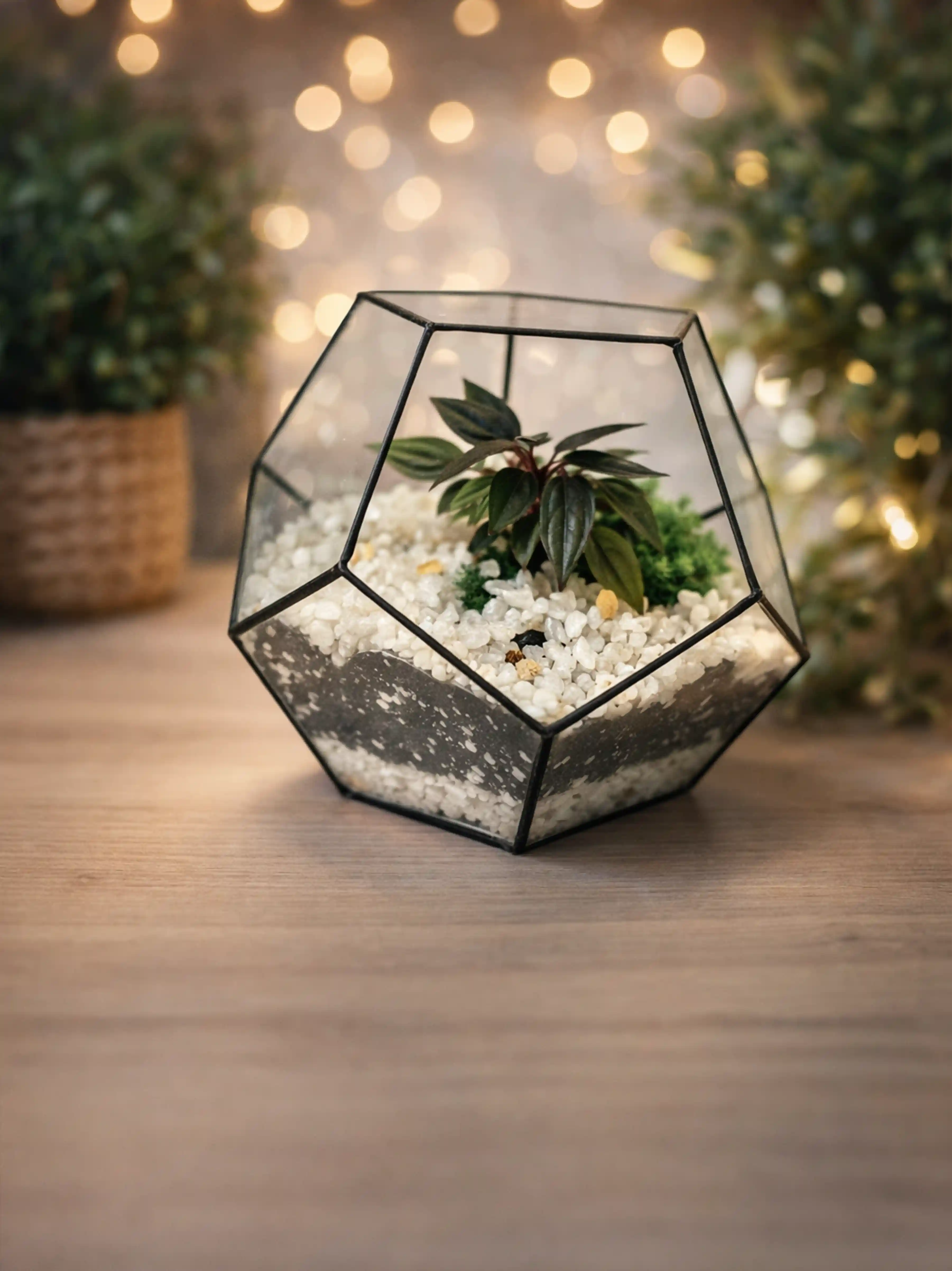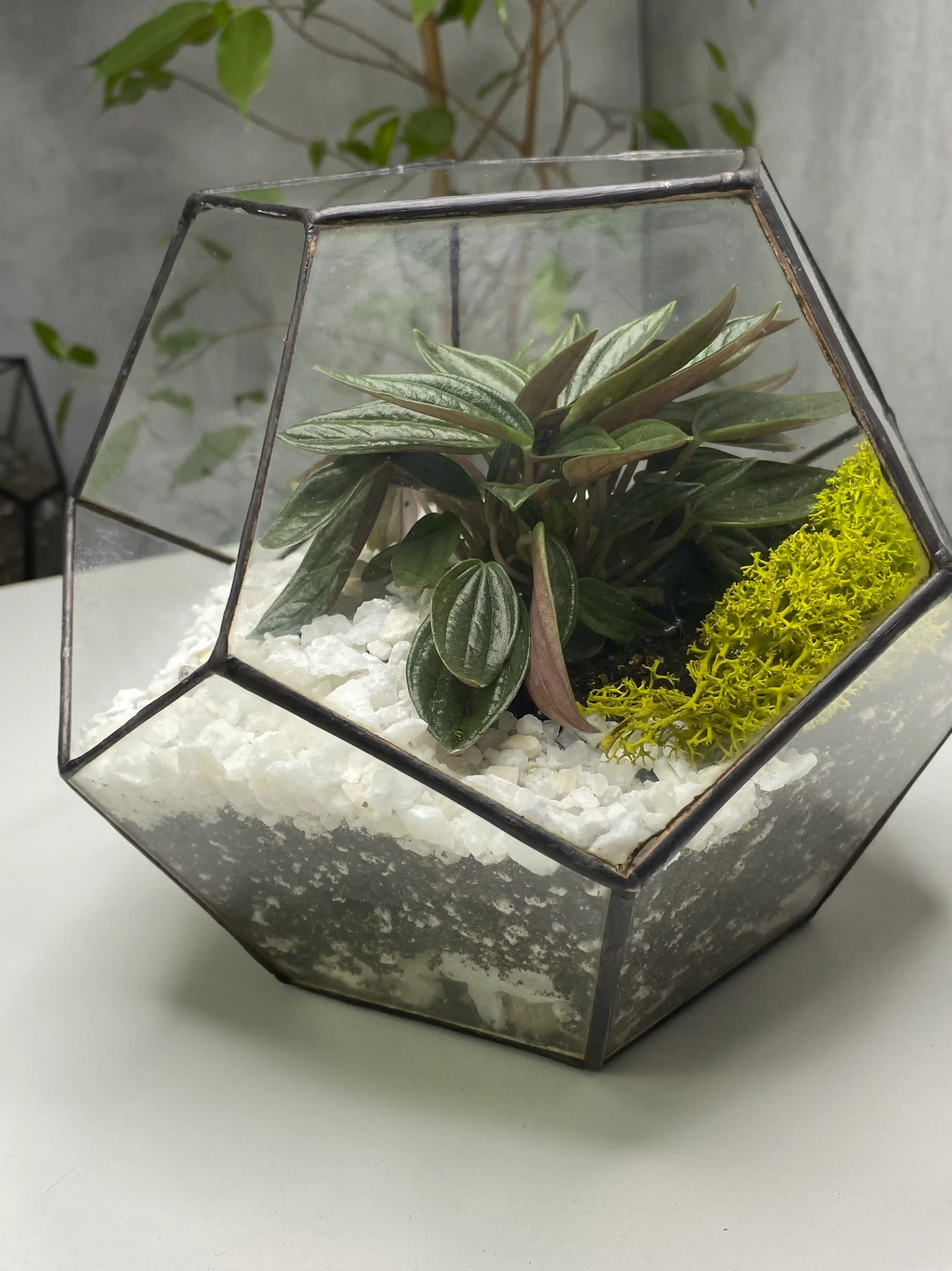 Пеперомия отличается устойчивостью к различным условиям и подходит даже для новичков в цветомоде. Она требует умеренного полива и адаптируется к разным уровням освещения. Благодаря компактным размерам, флорариум легко разместить на столе, полке или в любой другой уютной зоне.